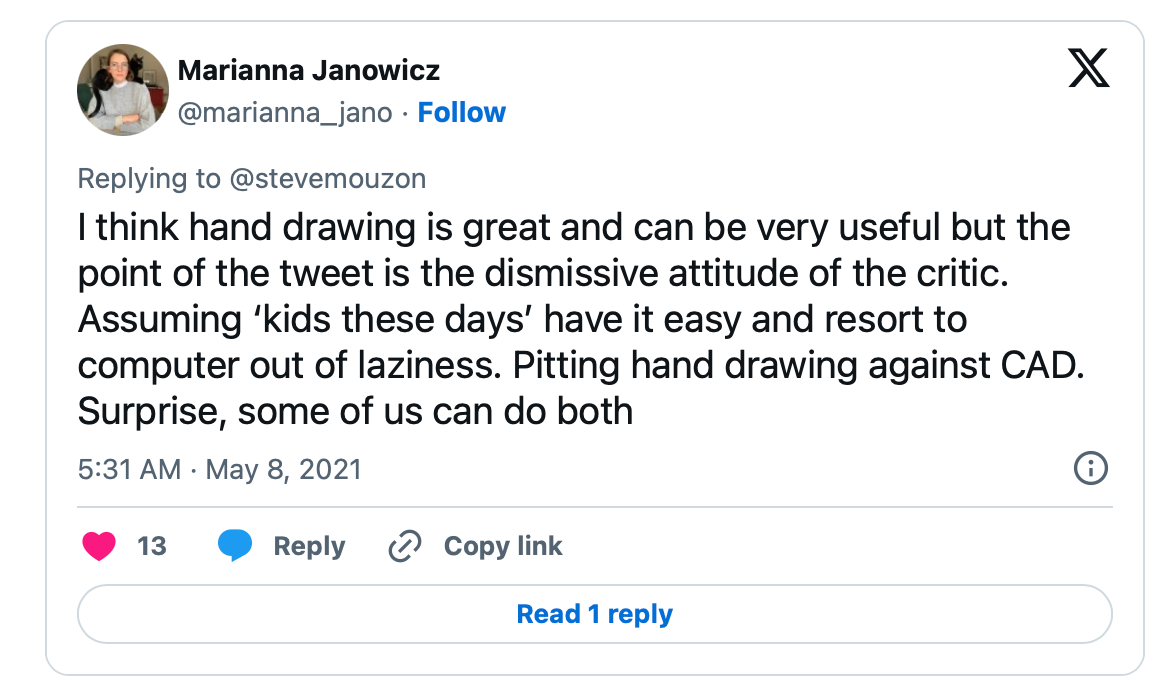 I'm now retired & whole heartedly agree. In the 90's I first used rough 3D print-outs of computer models of my designs under velum to speed up marker renders. In the early 2000's it was meshing CAD renders in Photoshop, & until a few years ago, renderings with textures all in the CAD render module. These were all based on the designs people like me & colleagues came up with. The CAD images have always left me cold, but clients wanted them. Now? Glossy AI images & the CAD images that support them are today's versions of Oil on Velvet images of Elvis.