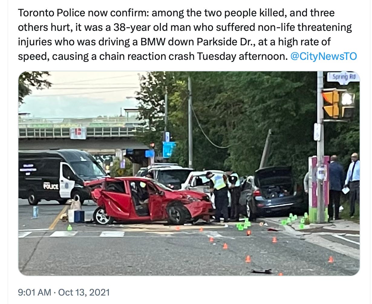 The cameras were installed after Valdemar Avila and his wife, Fatima, were killed by a super speeder. One would think that the government would get on the case to find out who is chopping down all these cameras, but this is Doug Ford’s Ontario, so he sided with the vandals and banned the cameras, saying, "Over the last few years, we've seen municipalities across the province use municipal speed cameras as nothing more than a cash grab. People are fed up."
