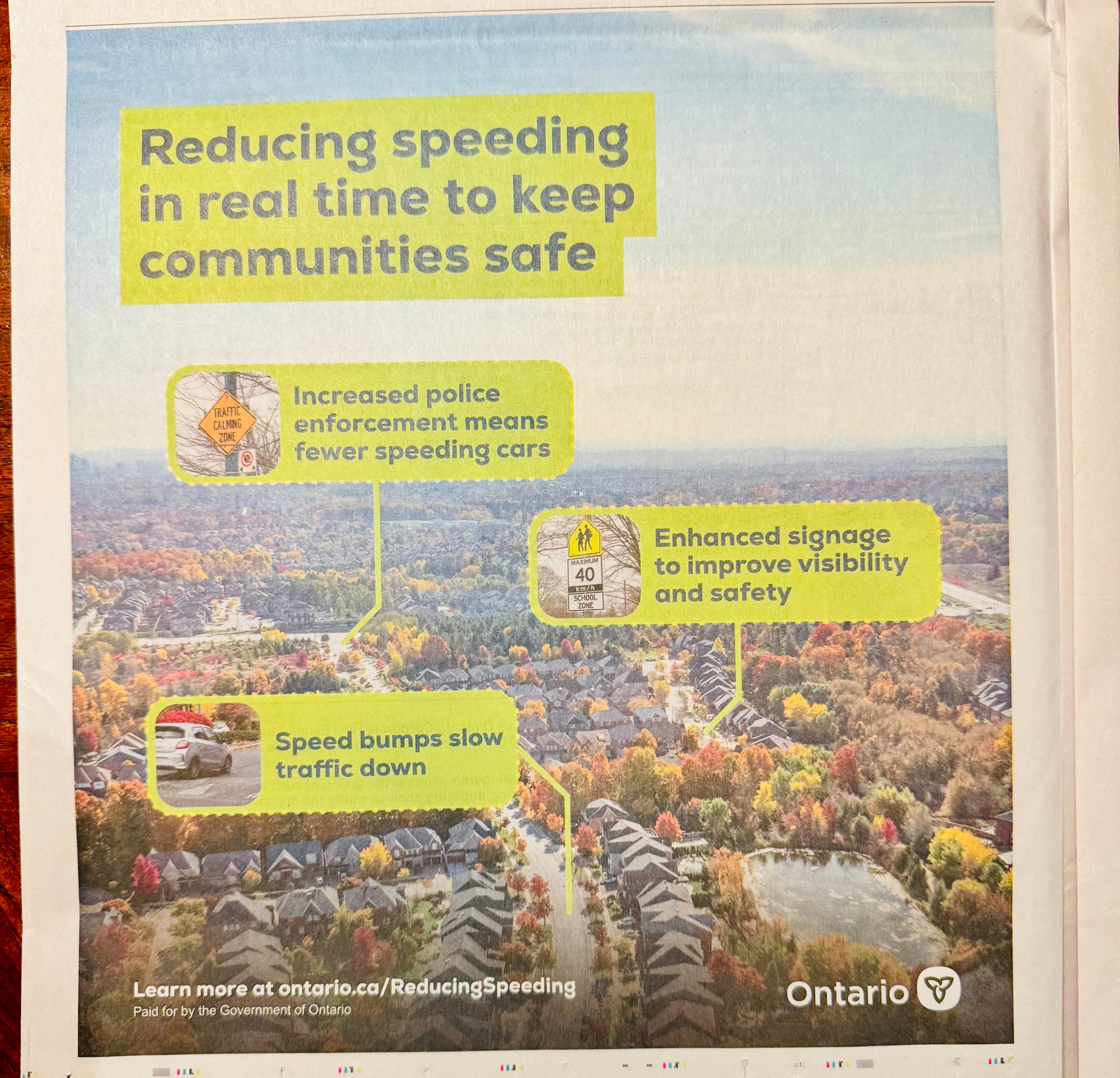 Instead, Doug Ford is running ads promising increased police enforcement, when the Police are no longer in the enforcement business, speed bumps, which don’t work on many of the roads with the worst speeding, and BIG SIGNS that nobody will pay attention to.