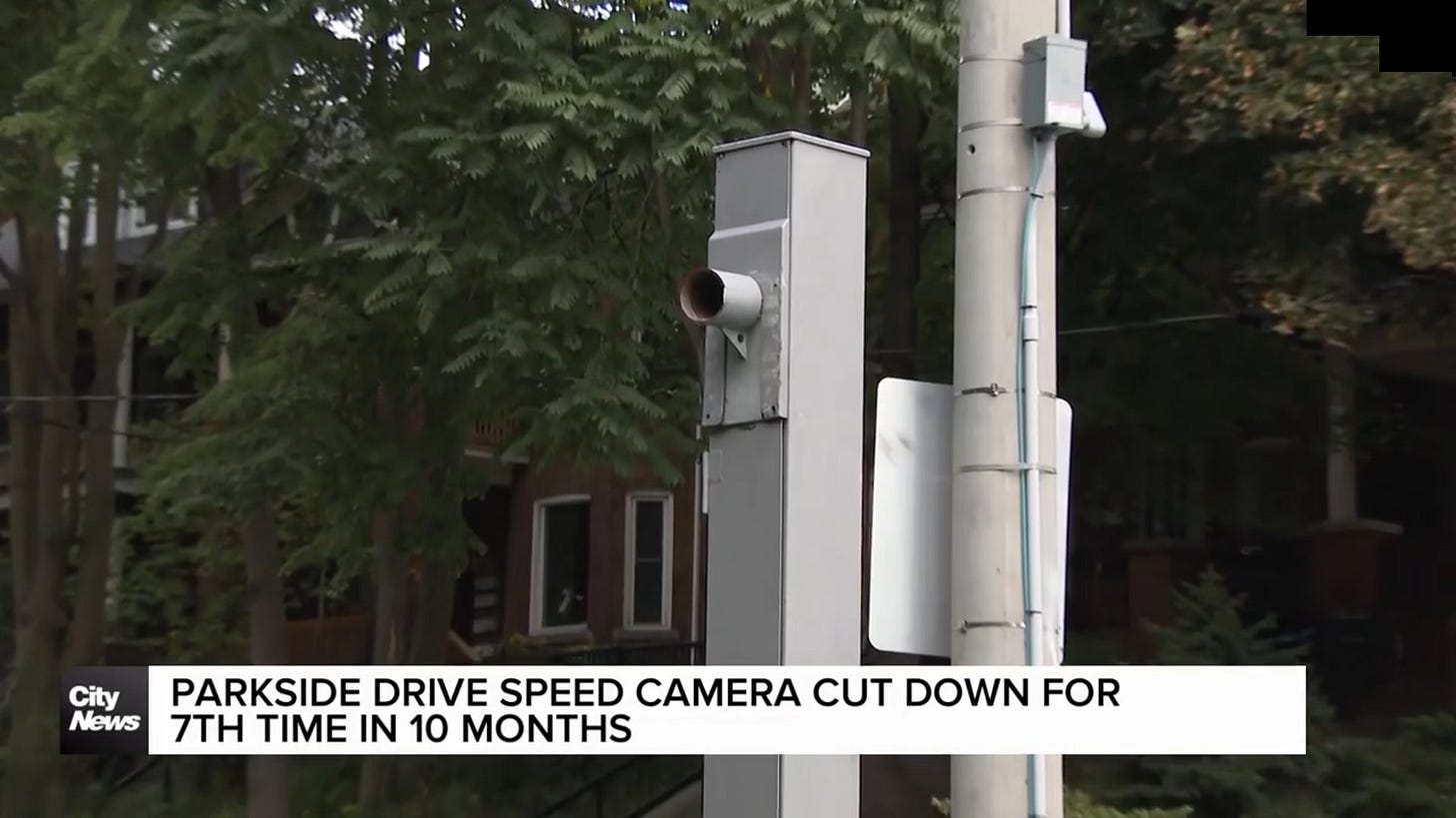 Of course, this approach only works if you have the speed cameras in place to find the super speeders. In Ontario, Canada, where I live, the cameras were constantly vandalized. One on Parkside Drive was chopped down seven times, and somehow, the Toronto Police Department couldn’t solve this one.