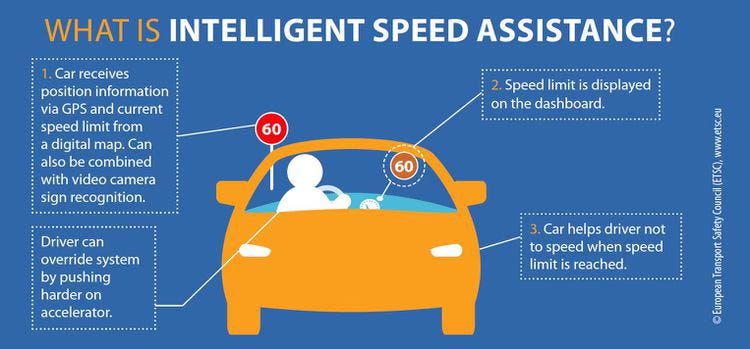 “Intelligent Speed Assistance” is the fancy new name for speed governors that work by linking speed limit recognition cameras and GPS data to let the driver know the speed limit and if the driver tries to go faster: "I'm sorry, Dave. I'm afraid I can't do that."