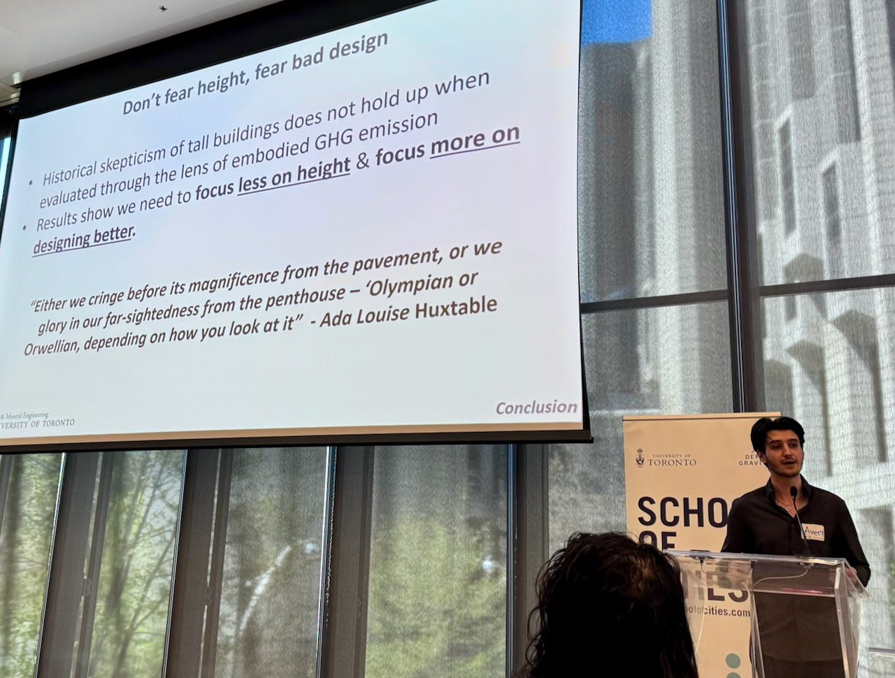 “Height is often assumed to be the central driver of embodied GHG emissions in new buildings, especially in structural building elements – this dovetails with the long history of suspicion of taller buildings. Embodied GHG arguments are being used to oppose housing construction and cut storeys off proposed new buildings.”