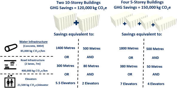 “Assuming construction with 200 mm thick floor slabs and the same total net floor area in each case, four 5-storey buildings have structural embodied GHG of 900,000 kgCO2e, two 10 storey buildings 930,000 kgCO2e and one 20-storey building 1,050,000 kgCO2e. This implies a savings of 120,000 kgCO2e if two 10-storey buildings are built instead of one 20-storey and 150,000 kgCO2e if four 5-storey buildings are built instead of one 20-storey, making it appear as though building shorter is a better option in terms of reducing embodied GHG emissions.”