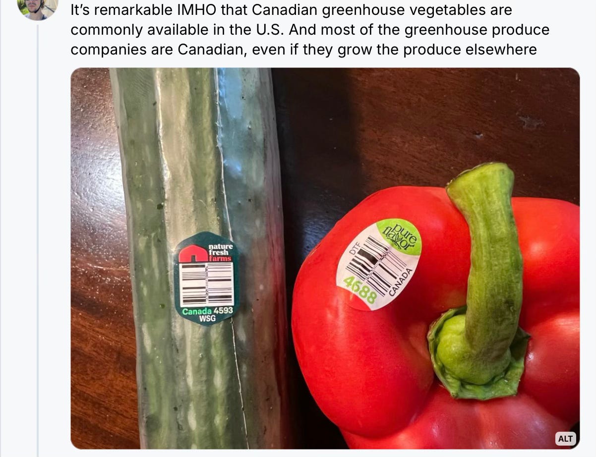 The author of a recent post on Bluesky was impressed that hothouse tomatoes from Canada (mostly from Leamington, Ontario) are available even in the United States.