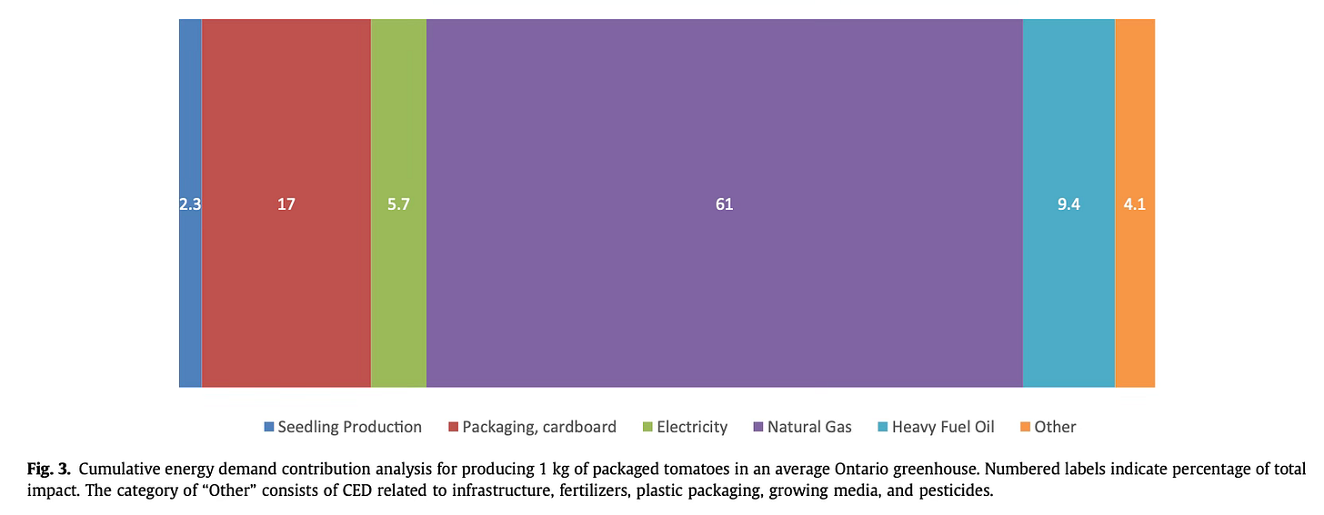 A 2017 study, Life cycle perspectives on the sustainability of Ontario greenhouse tomato production, is not very appetizing. It found that the production of a kilogram of tomatoes consumed 28.9 MJ of natural gas and 4.06 MJ of bunker fuel or #2 oil (for the greenhouses not connected to gas). Burning the natural gas for a kilogram of tomatoes releases 1.3 kilograms of CO2.