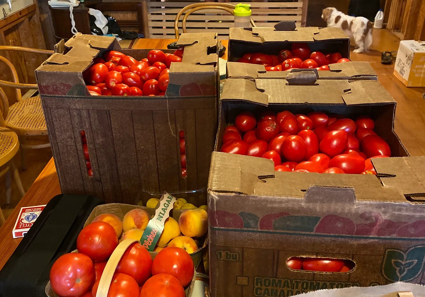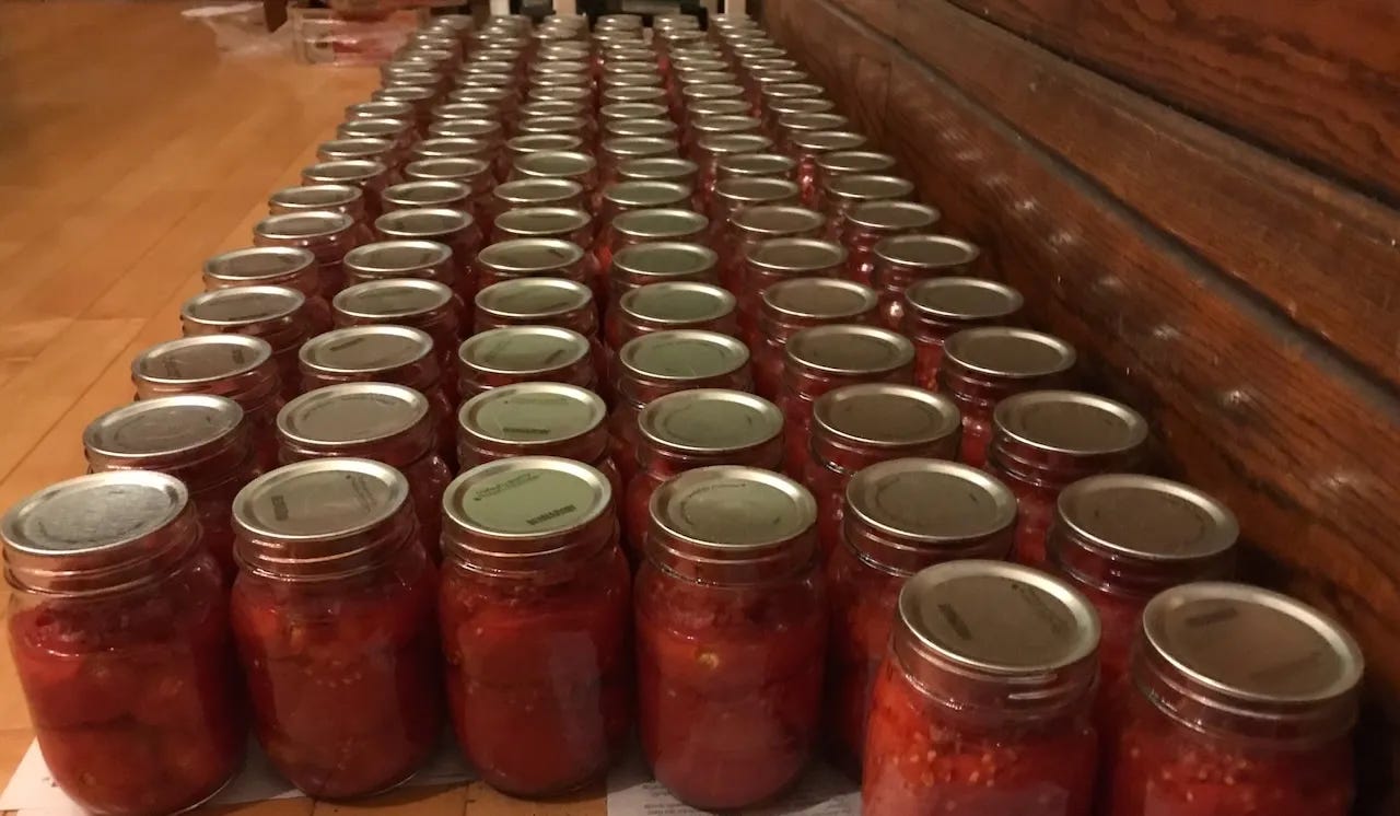 This is why, every August, my wife Kelly buys boxes of field tomatoes and spends a few days processing them, so we have tomatoes in in January that don’t come from greenhouses. I noted in an earlier post that “If you are eating hothouse tomatoes, you are eating natural gas. If you are eating imported tomatoes, you are dining on diesel.”