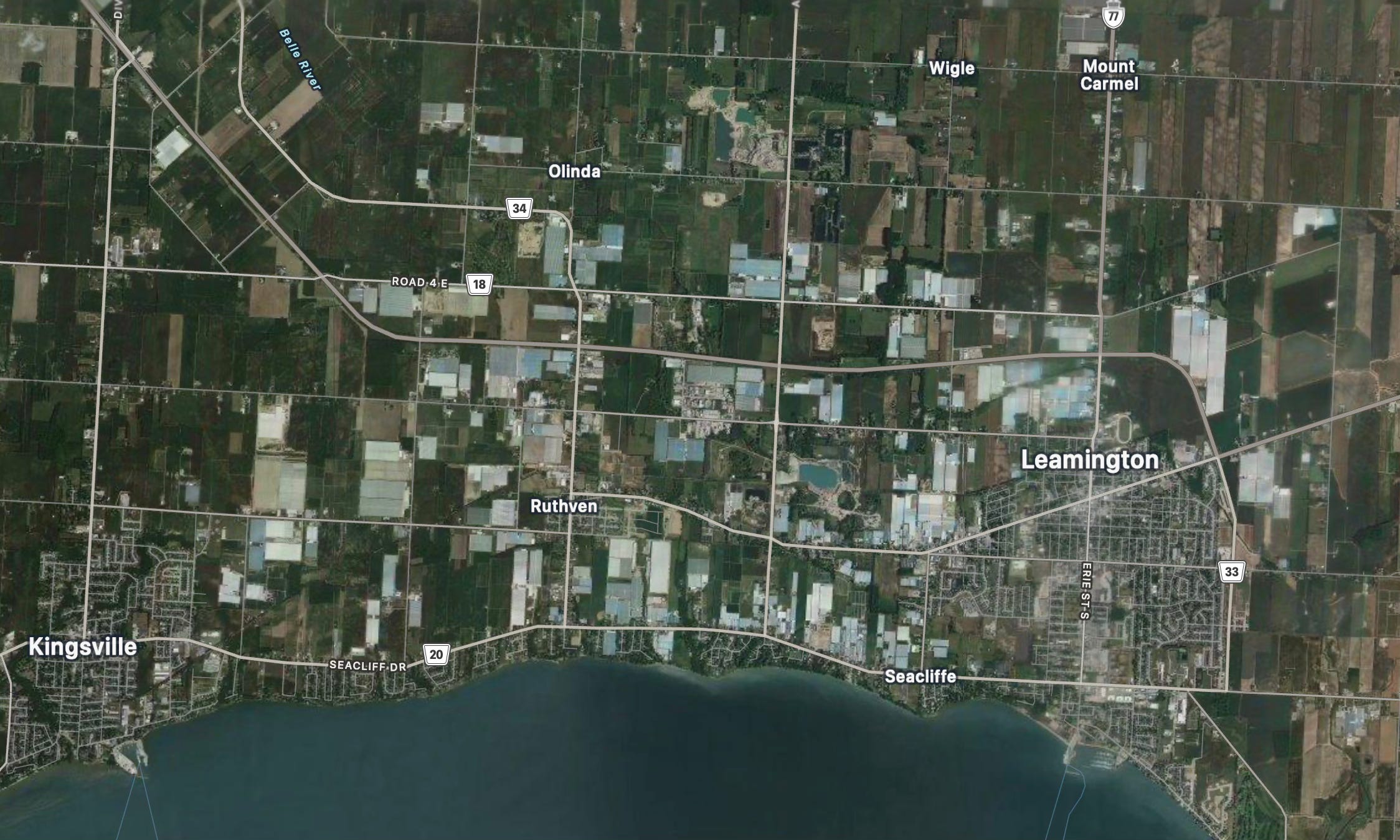 It’s a big industry; Leamington and Essex County produced 644,207 metric tonnes of tomatoes in 2024. Apple Maps shows how the area is covered in greenhouses.