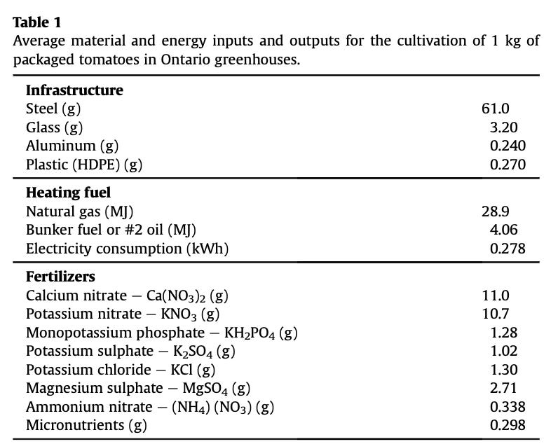 Smil also notes that “greenhouse tomatoes are among the world’s most heavily fertilized crops: per unit area they receive up to 10 times as much nitrogen (and also phosphorus) as is used to produce grain corn, America’s leading field crop.” I cannot figure out how much CO2 is emitted in making the fertilizers, but as I wrote in my book, Living the 1.5 Degree Lifestyle,